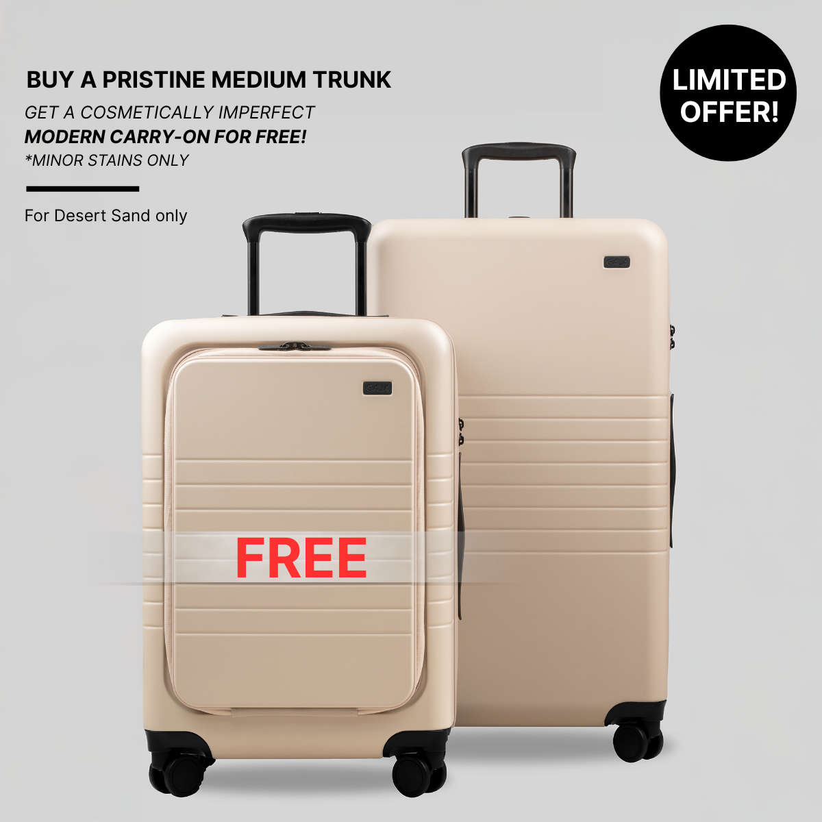 We’re clearing out our sample + slightly imperfect Desert Sand Carry-Ons — and giving them away for FREE when you purchase a Medium Trunk in Desert Sand.